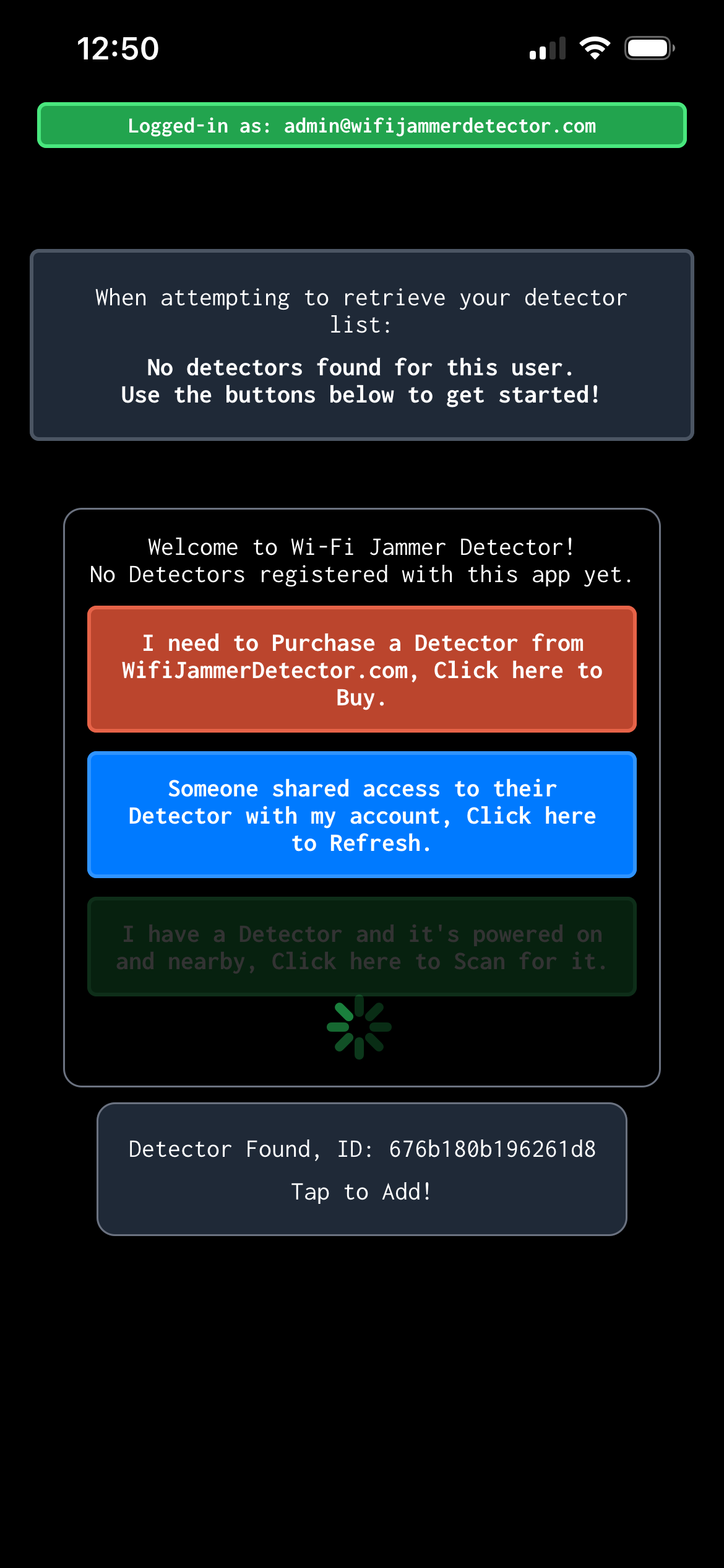 You will see the device show up below, make sure the ID matches the sticker on the back of your detector. If you do not see the device, make sure the device is powered on and you are near it (same room).