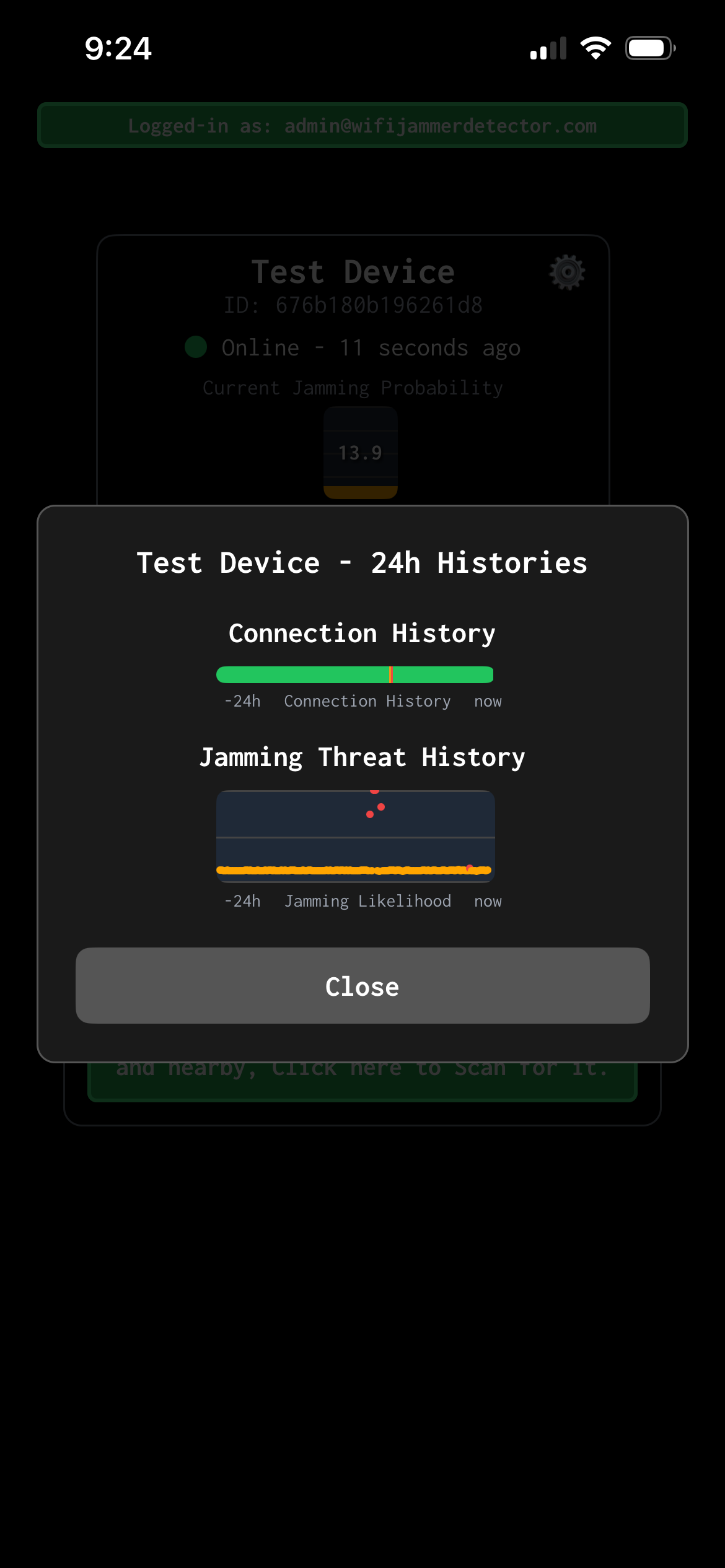 Finally, you can click on the device tile to load the 24-hour histories of online/offline status and the Jamming detections: